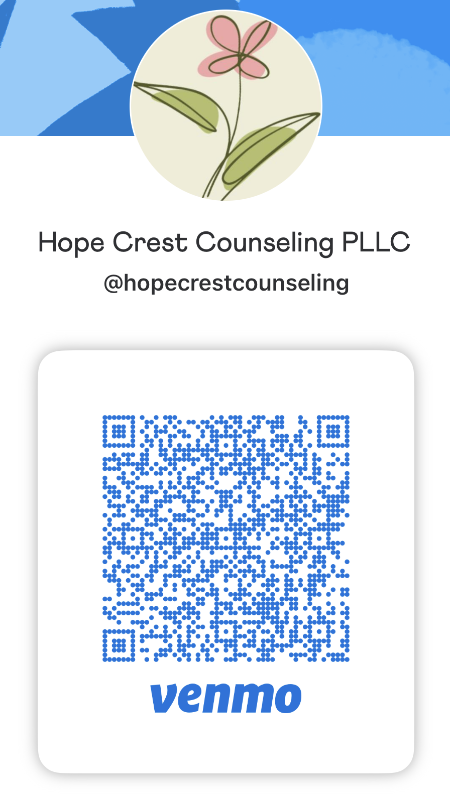 We offer Venmo as a convenient option for select payments, including group sessions, donations, and Hope Crest Counseling products (when available). Please note that Venmo is not used for insurance-based services or standard therapy session billing.
