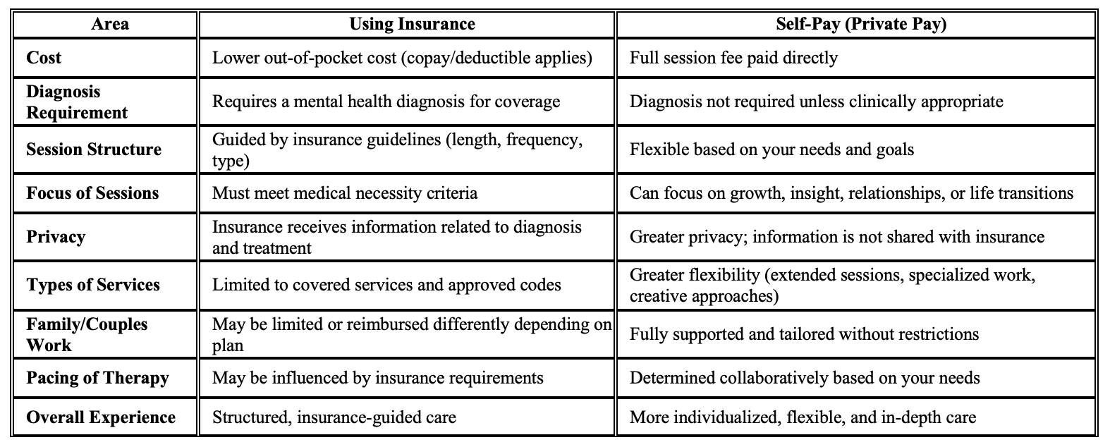 Some clients choose to combine both options—using insurance for individual sessions while engaging in self-pay services for: