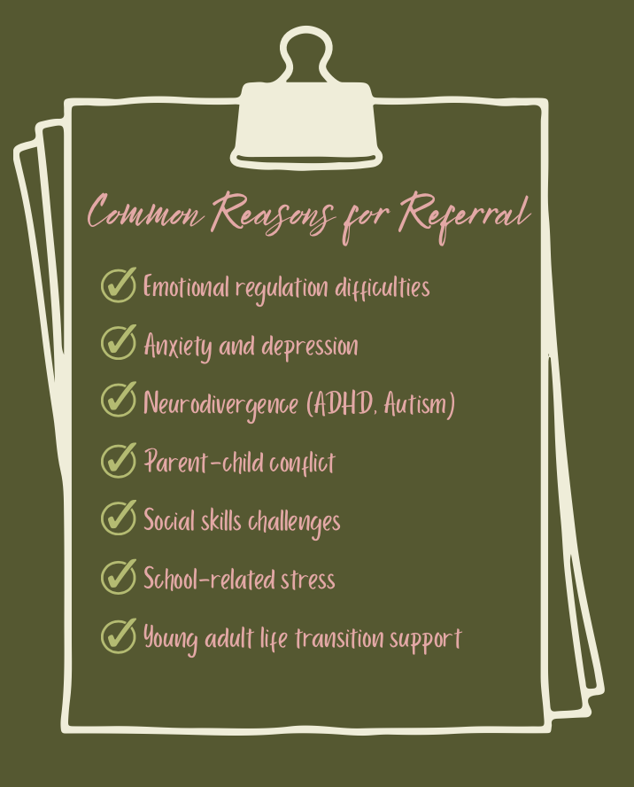 We offer specialized support for children, adolescents, young adults, and families through creative, connection-based, and evidence-informed care. Our clinicians work with a wide range of concerns including anxiety, depression, emotional dysregulation, relationship difficulties, neurodivergence (including ADHD and autism), grief and loss, and challenges related to life transitions.